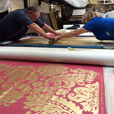 We offer traditional Hand Silk Screen Printing which requires 2 printers to print the screen(s).This facility is very flexible and can be used for producing bespoke collections and showroom samples. A mini screen service is also available for sampling new designs and colourways. Our Hand table is 50 metres in length by 1.44 metres wide (57 inches) and can print an unlimited number of colours.