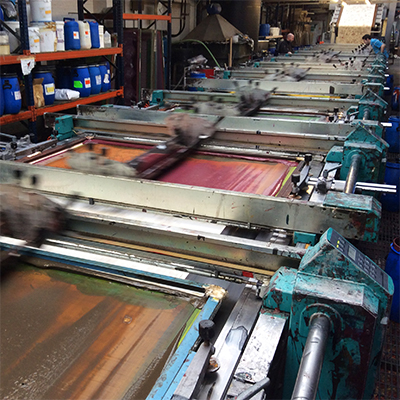 Flatbed Printing Our Flatbed machine prints up to 14 colours using conventional screens that are engraved on site.The machine is particularly flexible with repeat sizes ranging from 50 cms to 3 metres in length.